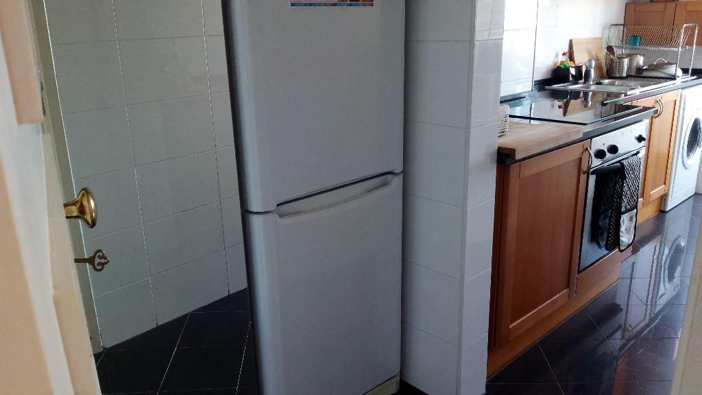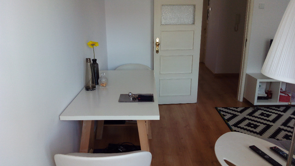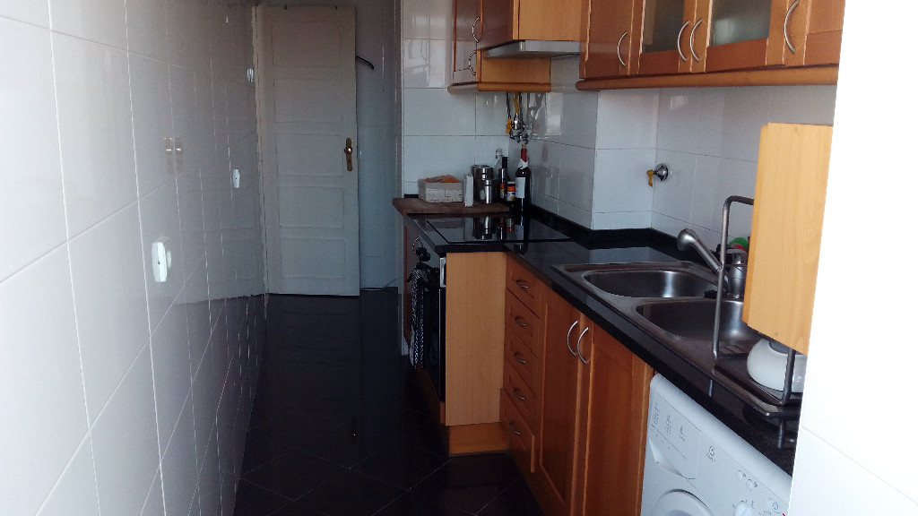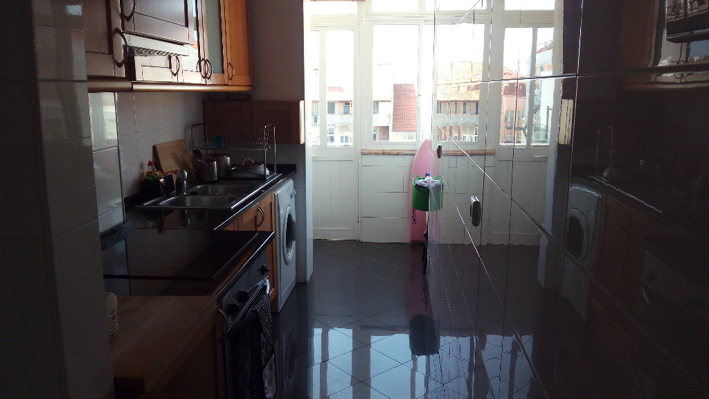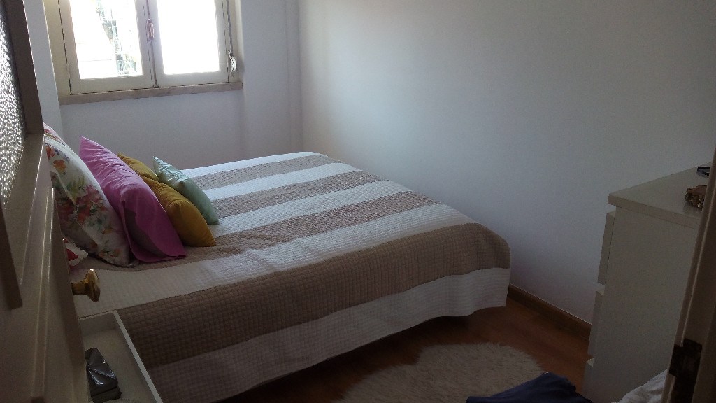 Sala com cerca de 18 m2, quarto com 11m2, hall com roupeiro, cozinha equipada e wc completo.